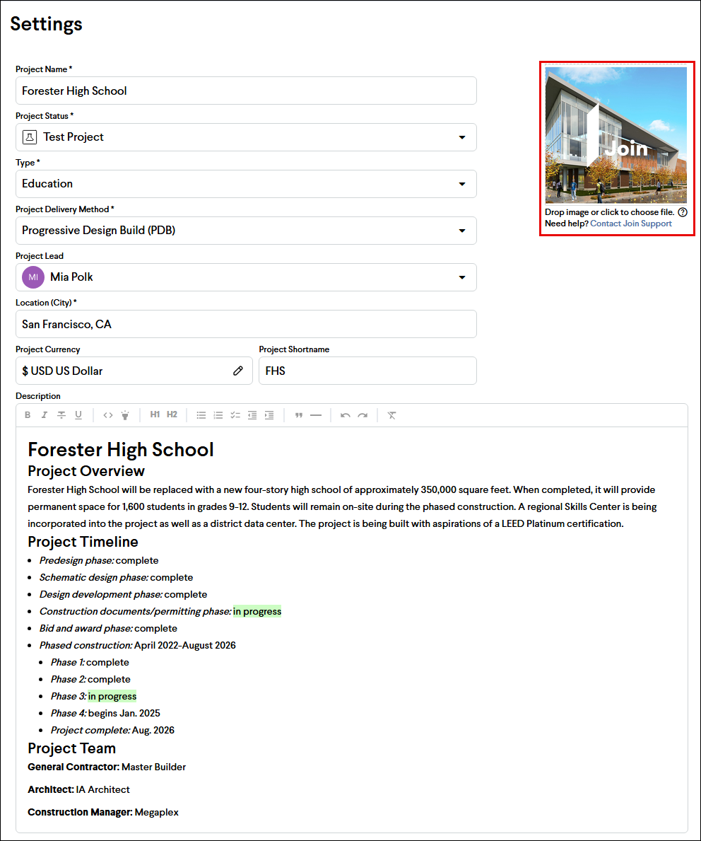 A project thumbnail allows your project team to quickly identify the project from others they may have access to. Join users typically upload a rendering of the project or another image that is unique to the project.