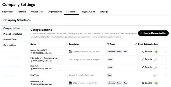 Create company standard Categorizations to ensure consistency across your projects and organization. Here, you can edit a Categorization's underlying categories, name, description, categorization type, and Smart Categorization view setting, which will be applied as the default settings when anyone in your company creates a new blank project.
