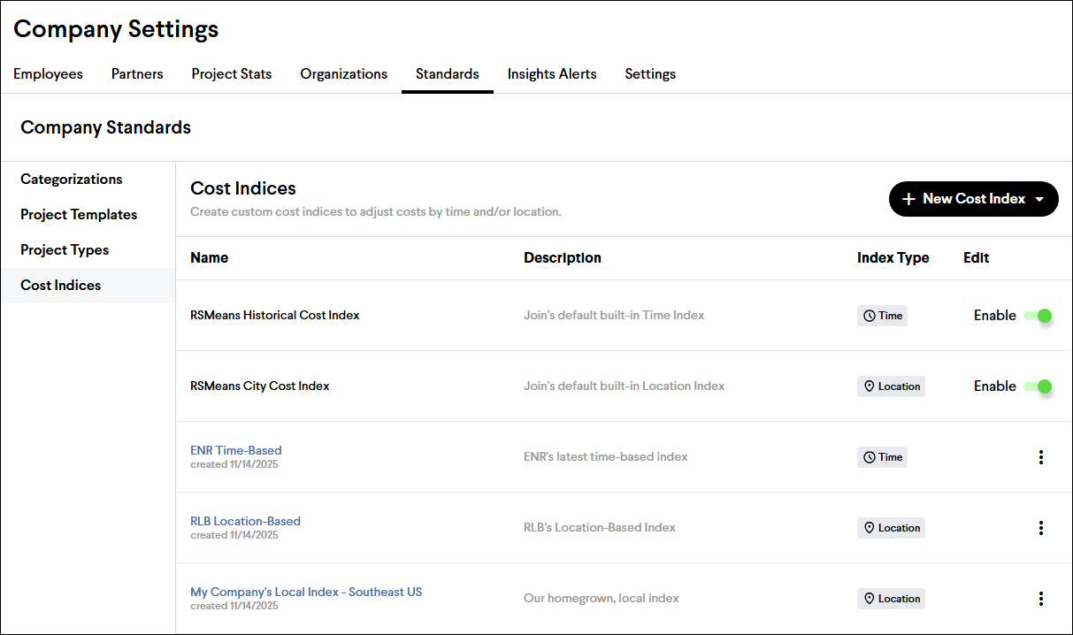 Create and manage custom cost indices to adjust costs by time and/or location in Project Comparisons reports. These cost indices will be available to everyone in your company who has access to Benchmarking.