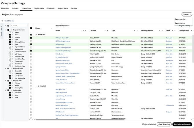 Furthermore, Project Type, Project Lead, Project Status, Project Delivery Method, and Organizations can be updated in bulk by checking the boxes on the far left and clicking the Edit Selected Projects button.