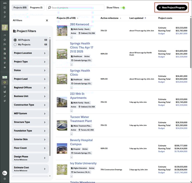 Note: Only companies with a current Join subscription have access to create a new project or program. If you need to create a project or program, but don't see the button, please reach out to the Join Support team at support@join.build.