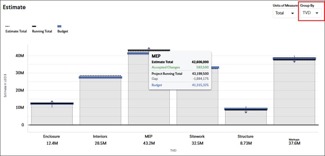 The dashboard Estimates chart can be grouped by custom categories. If your milestone estimate is coded to custom categories, you will see that categorization name displayed in the “group by” dropdown bar. If your milestone estimate is organized by multiple categorizations (e.g., UniFormat, MasterFormat, and a custom categorization), you can easily toggle between them on your estimate graph. When you select a categorization, the bar chart will display the costs for each category.