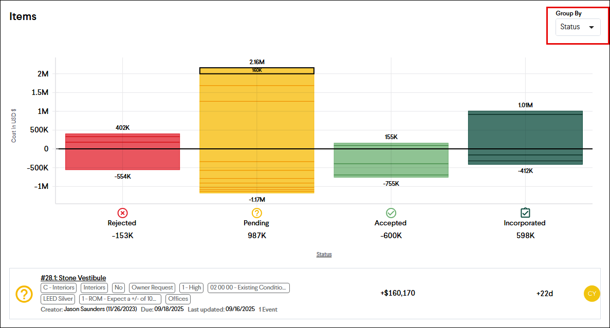 The dashboard Items chart can be grouped similarly using any custom categories. When you choose a categorization, the Items in your active milestone will be grouped accordingly. Items can also be grouped by their status (e.g., pending, accepted, rejected).