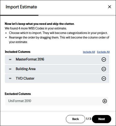 - Select which WBS Codes to include or exclude from the import, rearrange the order by dragging them, and then click the Next button.