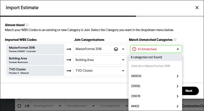 - If necessary, adjust the mapping of the WBS Codes to existing or new Categorizations in the Project. You can also select your company's standard single-level and multi-level Categorizations here if they have been set up in the Admin Console. If your import has any matching errors, you can correct them here before importing, then click the Next button.