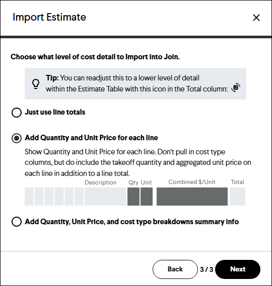 - If the estimate file contains a detailed cost breakdown, an option to select what Cost Breakdown level is imported will be displayed. Select the desired level of cost detail and click the Next button to finalize the import process.