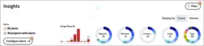 The top section of the Insights page is a portfolio summary of all your company's projects. This section includes:- A summary of alerts on your projects