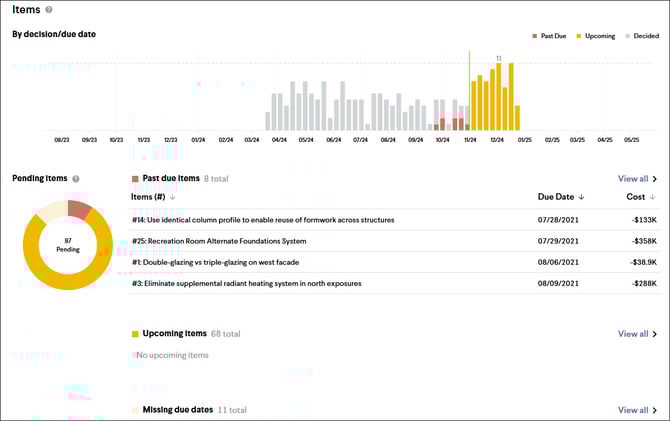 Keep your project decisions and team on track by seeing the status of past and upcoming decisions.