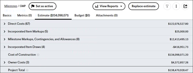 Track Owner Costs separately from Milestone Markups for a complete view of the total project costs. The Owner Costs table is below the Cost of Construction. These costs are included in the Project Total. Owner Costs function similarly to markups and can't be added as direct costs.