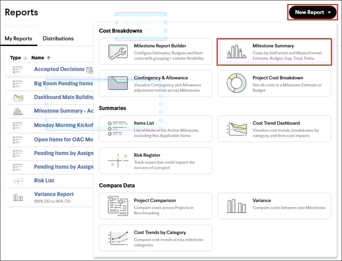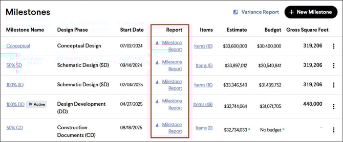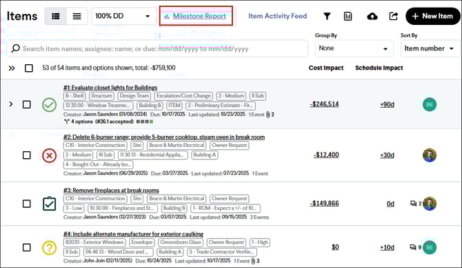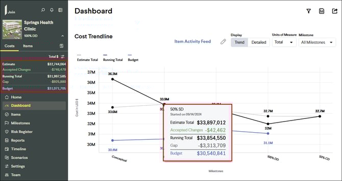 Milestone Summary Report: With a new Milestone uploaded to Join, you can share a customized Milestone Summary Report to update your team on the revised cost estimate.