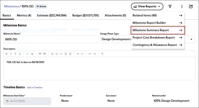 The Milestone Summary Report provides a summary-level overview of costs within a Milestone.
