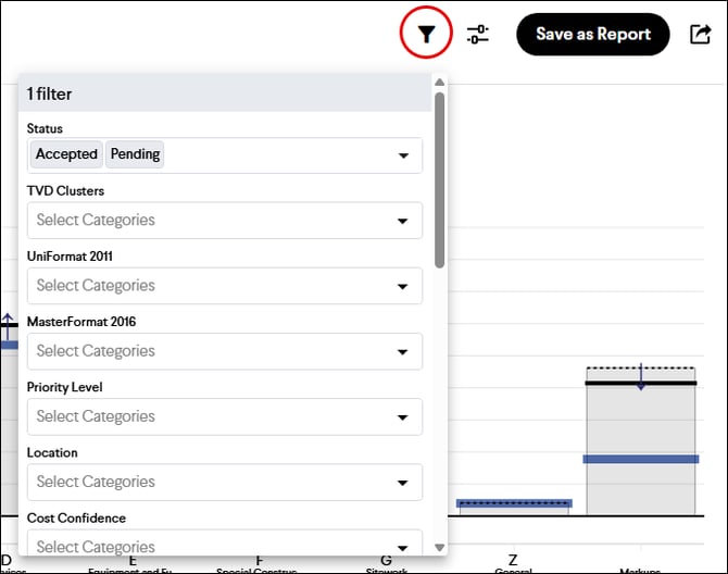 The report can be filtered by any categorization associated with the Estimate and Items. The Items included in the report can also be filtered by their status. The filter tool is located in the upper right-hand corner of the page and looks like a funnel. Once selected, it will display a list of categorizations for filtering.