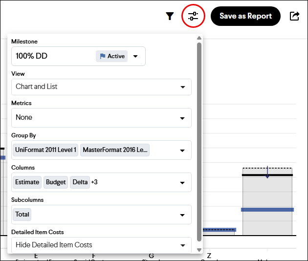 The report can be edited using the report settings menu located in the upper right-hand corner. Here you can choose the Milestone, View, Metrics, grouping hierarchy, columns, and detailed Item cost inclusions.