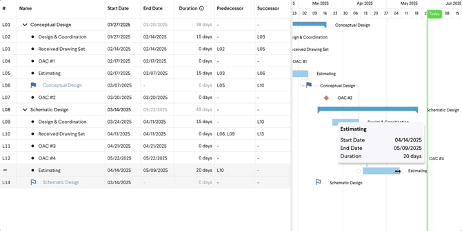 Edit your timeline activities like a traditional schedule. Timeline supports simple dependencies, such as Finish-to-Start. To schedule your activities: