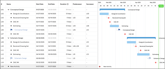 Tip: Plan ahead with future Activities & Milestones. Add activities to keep your team aligned on progress toward delivery. Examples: Milestone: GMP, or Activity: OAC Meeting