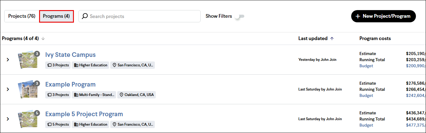 Use the Programs list to view and access all of your Programs. This list includes the Program name, thumbnail image(s), key metadata, who last updated the project(s) and when, and high-level cost information. The Program can be expanded to see a list of the projects included in the Program. To access the Programs list, follow the steps below.