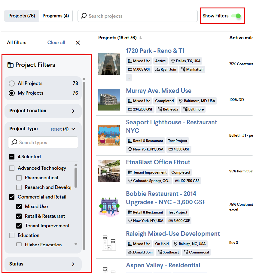 The list view can be filtered by several different fields to find relevant projects quickly. Start by enabling the Show Filters toggle at the top of the page to expand the filters panel on the left. From here, you can filter the view by the following fields: