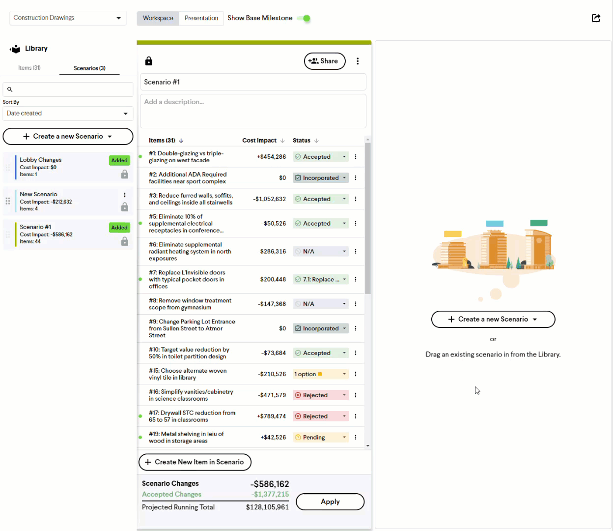 Explore potential paths forward for a project using Scenarios. Once you select the desired Scenario, apply the changes to your project.