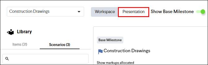 When ready to present scenarios to the team, select the Presentation view at the top of the Scenarios page.