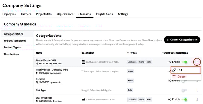- Streamlined project setup: Since standard Categorizations are automatically included on all new projects, this will reduce the time it takes to get up and running. You can also include them in your company's project template.