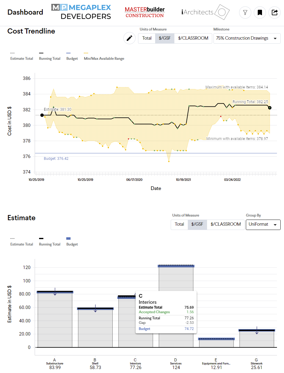 The costs shown in the Cost Trendline and Estimate charts on the Dashboard can be displayed as Total cost or cost per unit of measure.