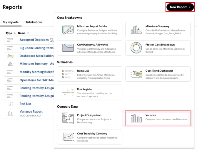 The Variance Report is used to compare any two values (Estimate, Budget, or Running Total) from the same or different Milestones. The Variance Report is an excellent tool for displaying changes in cost. It presents this information with an Estimate Chart and/or a summary list of costs and Items. This report differs from others as it is generated with step-by-step instructions. Once the desired report is generated, it can be saved and shared with the team.
