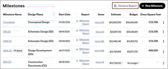 Quickly compare costs between any Milestone Estimate, Budget, or Running Total with the Variance Report.