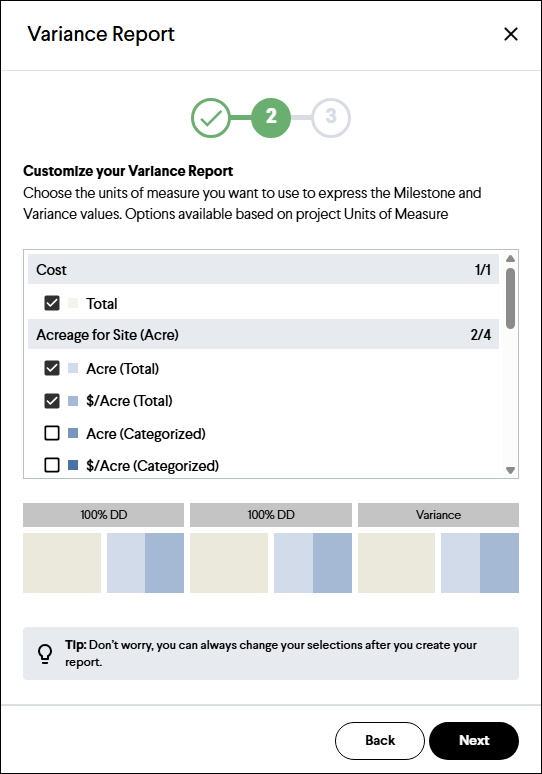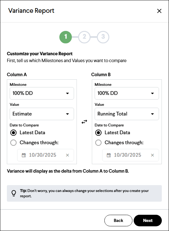 - Select which Milestones, values (Estimate, Budget, Running Total), and dates to compare, then click the Next button.