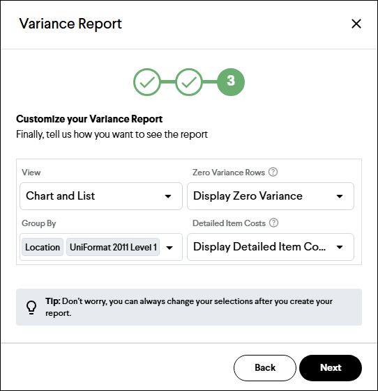 - Select your view settings (chart, list, or both), category grouping, variance display (show or hide zero variances), and Item cost display (show or hide detailed Item costs), and then click the Next button.