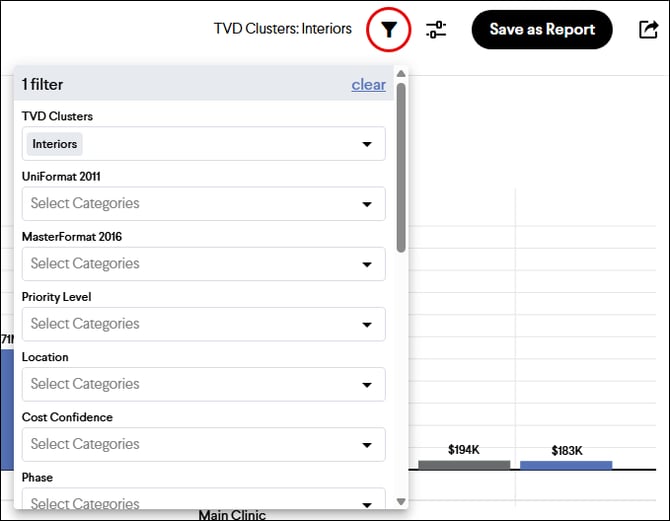 The report can be filtered by any categorization associated with the Estimate and Items. This filter will apply to both the chart and the list sections of the report. The filter tool is located in the upper right-hand corner of the page and looks like a funnel. Once selected, it will display a list of categorizations for filtering.